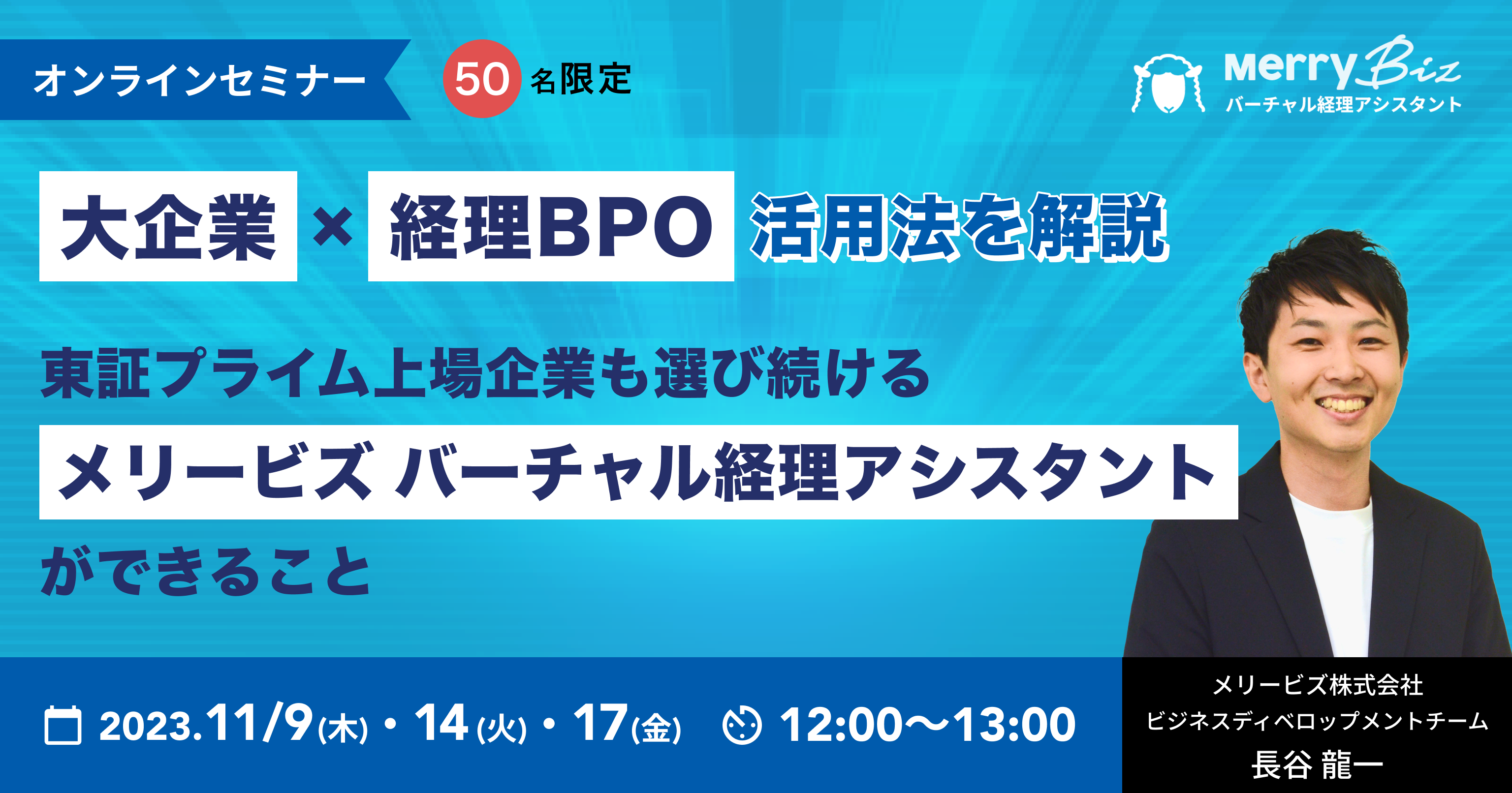 本セミナーでは、そんな経理BPOの活用法や導入までのよくある問題を徹底解説します。オンライン経理アウトソーシングやDXコンサルティング事業において累計850社以上の支援を行ってきたメリービズより、上場企業や大企業にも選ばれるメリービズの経理BPOサービス『バーチャル経理アシスタント』についてご紹介。