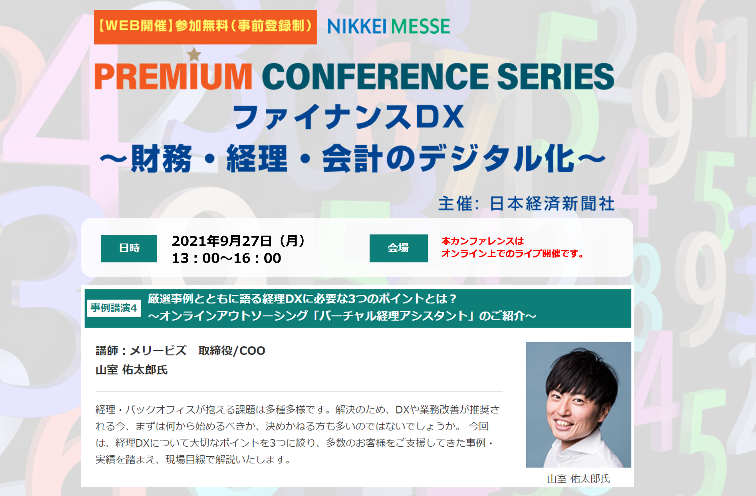 2021年9月27日(月)、日本経済新聞社主催「PREMIUM CONFERENCE SERIES ファイナンスDX ~財務・経理・会計のデジタル化~」にメリービズが登壇いたします。
