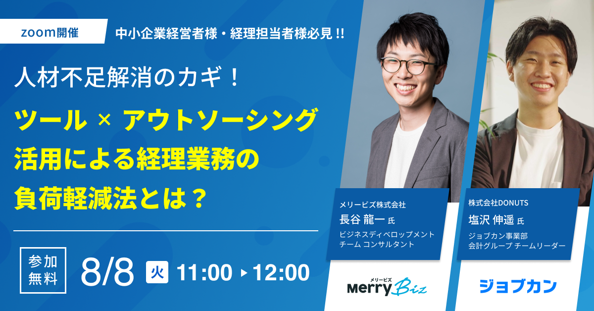 本セミナーでは、オンライン経理アウトソーシングやDXコンサルティング事業を展開するメリービズ株式会社と、経理周りの業務を効率化するジョブカンシリーズを展開する株式会社DONUTSにて、経理業務が直面する課題やその解決策を実際の事例も交えながら徹底解説いたします。