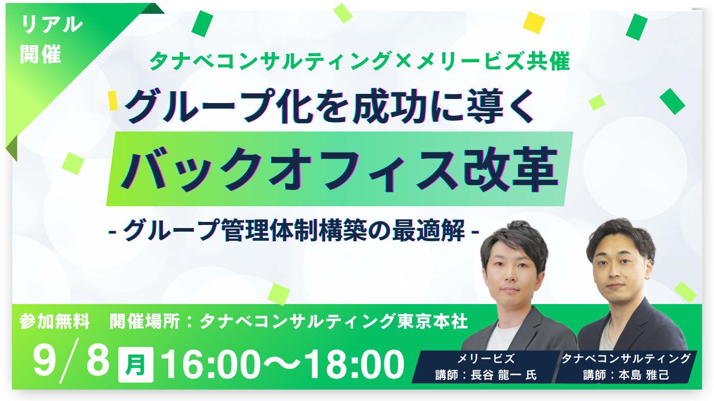 本説明会では、ホールディングス・グループ経営を企業と伴走し、一気通貫で推進するタナベコンサルティンググループと、M&A後の経理業務支援やシェアード体制の構築を実行してきた経理BPO支援企業メリービズが登壇し、ホールディングス・グループ経営体制を進める企業が直面した課題とその解決策について、具体的な事例を通じてご紹介します。